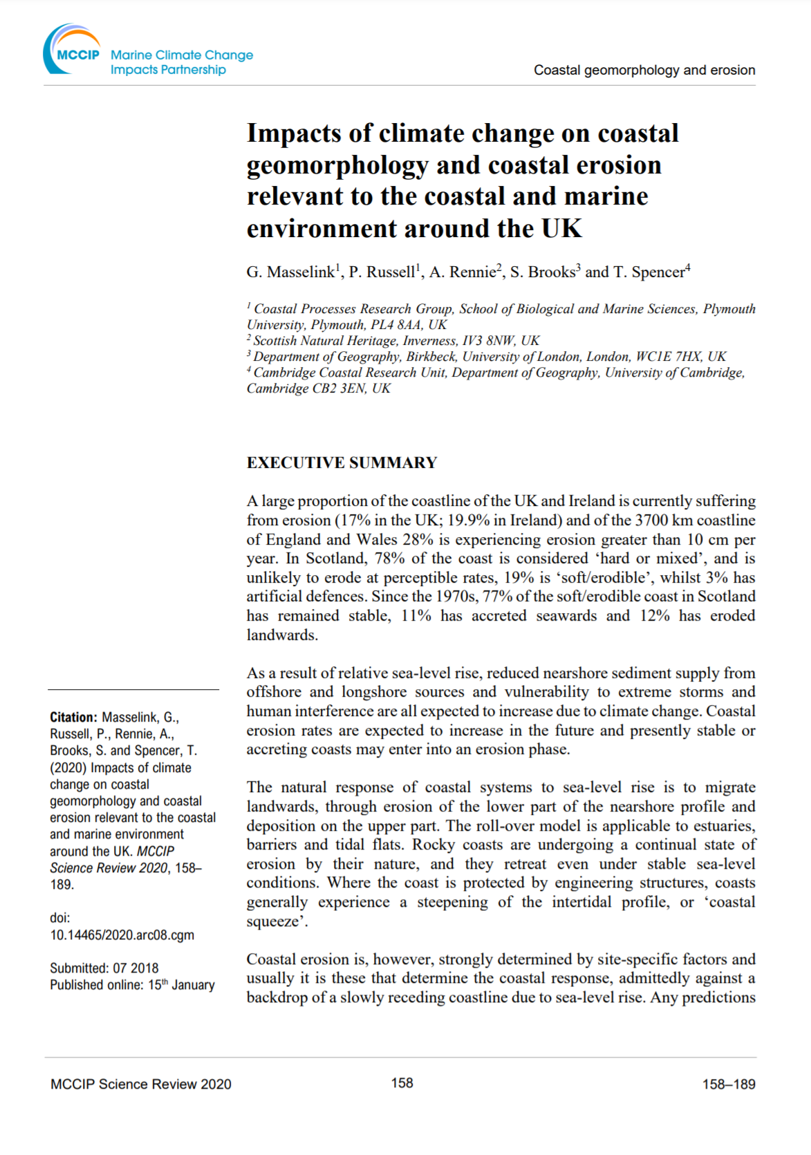 - MCCIP: Impacts of climate change on coastal geomorphology and coastal erosion relevant to the coastal and marine environment around the UK